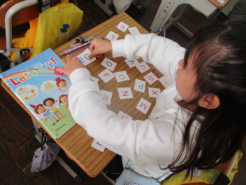 現在は、アルファベットの学習を行っています。カードを並べたり、「ABCの歌」を歌ったりしながら覚えていきます。ローマ字で慣れているはずですが、戸惑っている様子も見られました。目をつぶっている間にカードを隠してそれが何であるか考える「ミッシングゲーム」にも積極的に取り組んでいました。