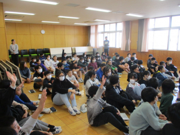 司会、スローガンの確認、実行委員長の話、修学旅行に向けての思いの発表など実行委員を中心に進めることができました。校長先生からは、修学旅行に向けて大切な話が伝えられました。明日からの2日間、「一致団結 友情とともに最高の思い出を!」のスローガンを達成し、最高の思い出をつくってきてください。(文責;教頭)