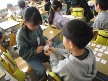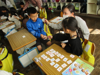 活動の最後には、自分の名前の頭文字をペアの子から受け取る活動を行っていました。「”D”card , please.」「Hear you are.」「Thank you.」の言い方にも慣れることができました。