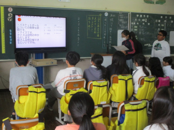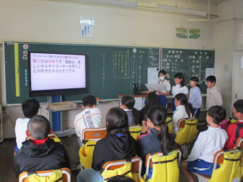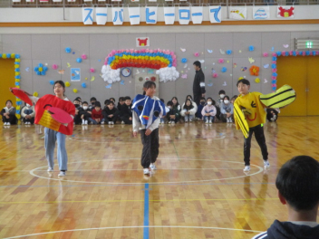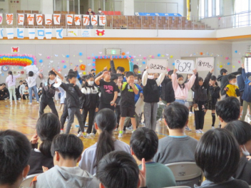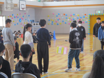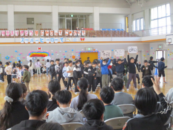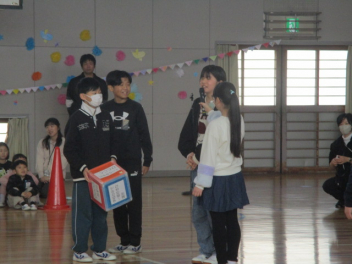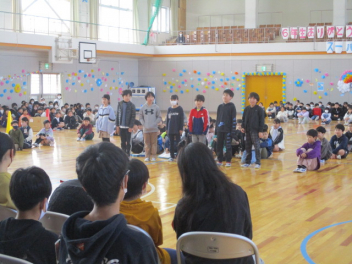 6年生に関わるクイズを出して気持ちを伝えました。「6年間で一番背が伸びた人は何センチメートル?」や「修学旅行で2番目に心に残った場所」などの問題が出されました。シンキングタイムには歌と踊りで場を盛りあげてくれていました。6年間で本をたくさん借りた人ベスト3も発表され、みんなから拍手をもらっていました。