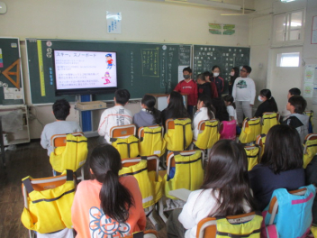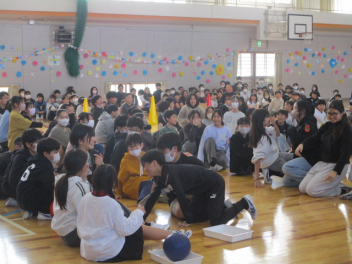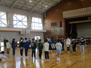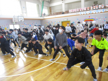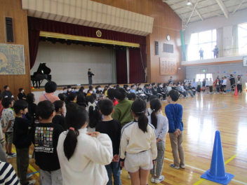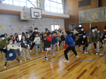6年生からのお返しの提案は、『一緒に「舞阪ソーラン」を踊ろう!』でした。1、2年生の前には6年生が立ち、お手本を示します。短い時間でしたが、体育館が笑顔いっぱいの空気でつつまれるのを感じました。さすがは舞阪小の6年生です。