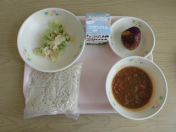 今日の給食は、ソフトめん 牛乳 みそカレーソース さつまいもの姿揚げ 野菜サラダ です