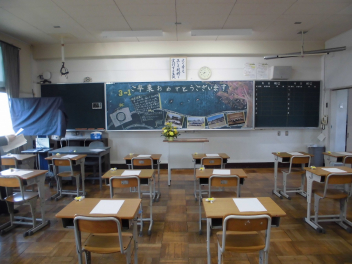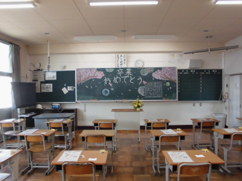 どの学級の黒板にも、担任や在校生からのメッセージが書き込まれていました。