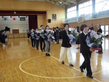 式には多くの生徒が集まり、代表生徒から感謝の言葉と花が贈られました。