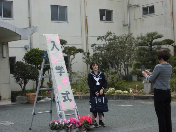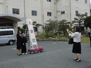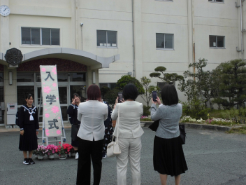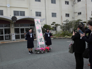 保護者の方々もみな笑顔で、入学式の看板を背景に写真を撮っていました。