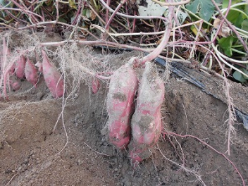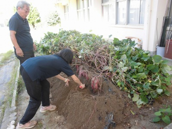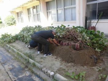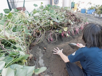 用務員さんが根を掘ったところ、たくさんのサツマイモが実っていました。