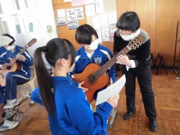 ギターの構え方、弦を押さえる箇所、弦のはじき方など、互いにアドバイスをし合いました。