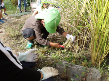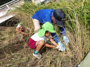 鎌を使って「じょりじょりじょり」と力を入れずに稲刈りをしました