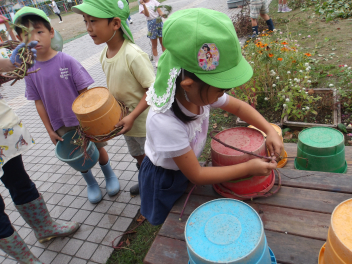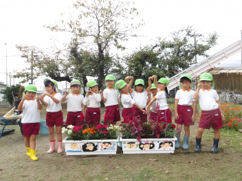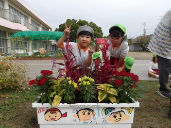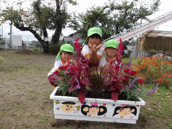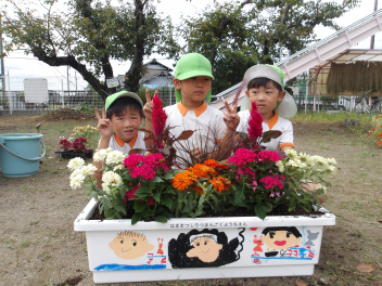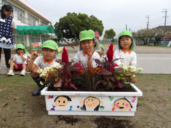 年長さんの植えた寄せ植えコンテナが飾られることになりました。