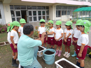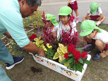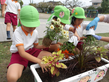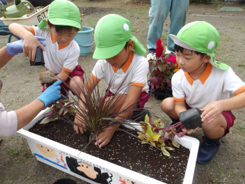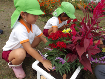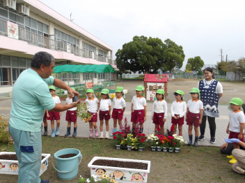 お花の植え方の説明を聞いて、いろいろなお花を植えていきました。