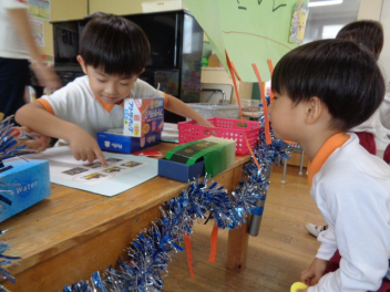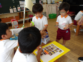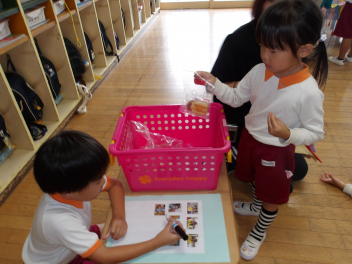 お菓子屋さんを開くために、「誰が来たかわからなくなるから、チェック表をつくったほうがいいんじゃない」「袋に名前を書いたほうがいいよね」「お菓子を買ったらくじができるようにしよう」などなど…友達と話し合いながら準備を進めてくれた年長さんですlaugh
