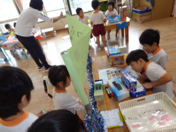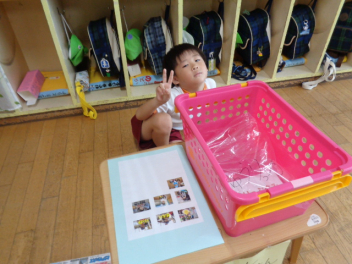 コンテナには年長さんが自分で描いた顔がかいてあります。
