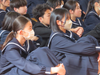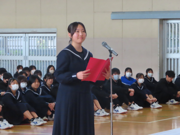 2年生の代表生徒は、「挑戦すること」「周りを見て行動をすること」の2つを意識して生活したと振り返り、「自分も含めて学年全体が周りを見て行動することができるようになれば、素晴らしい集団にられるのではないか。」と締めくくりました。