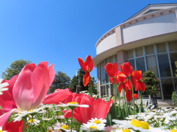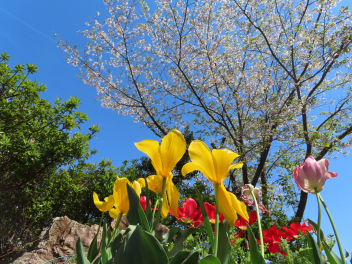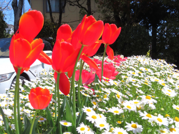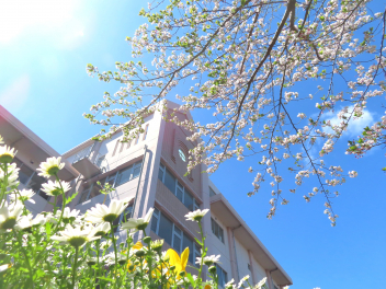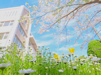 4月1日の朝、正門の花壇と桜の花がいい感じでコラボしていました