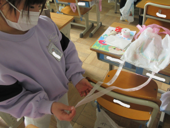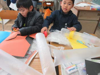 家から持ってきた材料を使い、凧や風車、風輪(かざわ)、傘袋ロケット等を作りました。