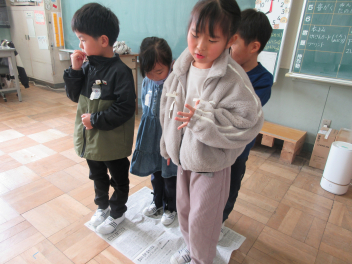 みんなで肩を組んだり、片足立ちで乗ったりし、新聞紙から落ちないように班で協力することができました。