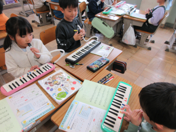 デジタル教材や鍵盤ハーモニカを用いて、試行錯誤しながら、班で旋律を組み合わせることができました。laugh