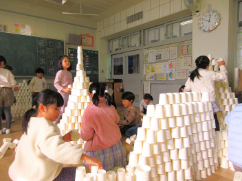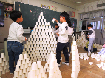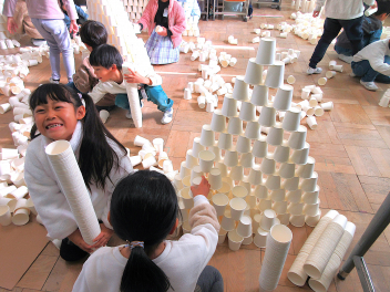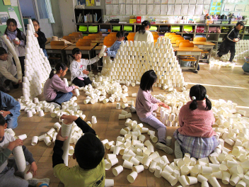 教室いっぱいの紙コップに目を輝かせる子供たち。cheeky