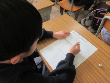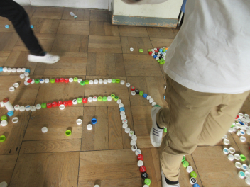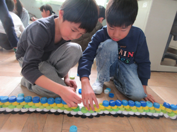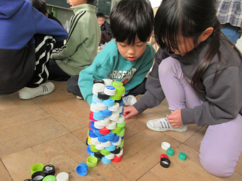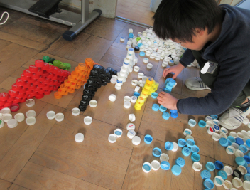 紙コップとの違いを楽しみながら、大量のペットボトルキャップを使って考えます。