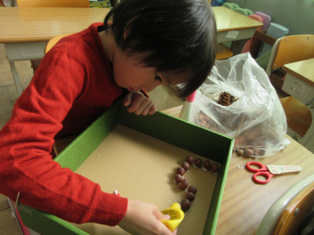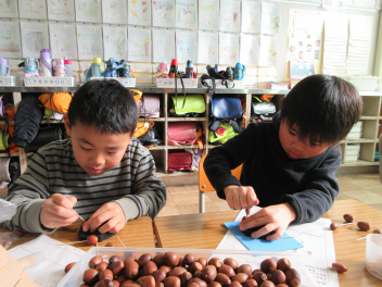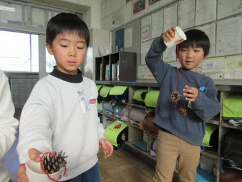 三方原神社で見つけてきたどんぐりや松ぼっくり、紅葉やイチョウの葉を使い、おもちゃを作りました。