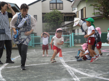バトンを持ってにこにこ笑顔で走ったり、友達の名前を呼んで応援したりして楽しく遊び、久しぶりに思い切り発散できた子供たちでした