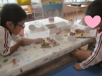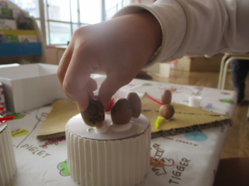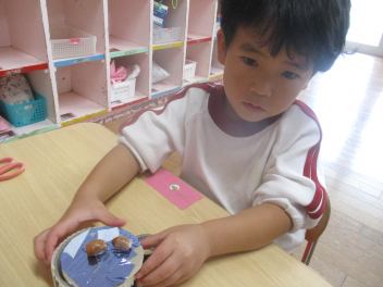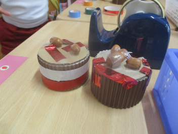 ボンドを使ったり、ドングリにトトロなどの顔がかいてあったり、おしゃれなケーキが出来上がりました
