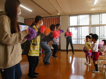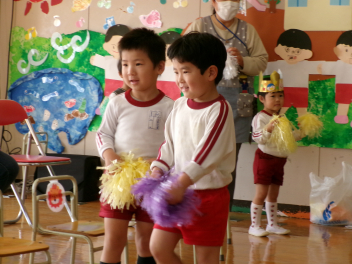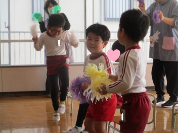 音楽に合わせて、ポンポンを持って踊ったり、元気いっぱい歌ったり、とても楽しい時間を過ごすことができました