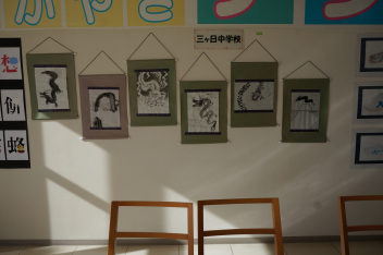 昨日から2月18日までの約1か月、7,8月に続き、この「輝きテラス」に三ヶ日中学校の作品が展示されています