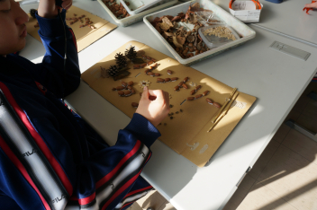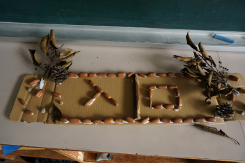こちらは木の実をホットボンドで貼り付けて看板のようなものを作っているようです