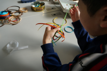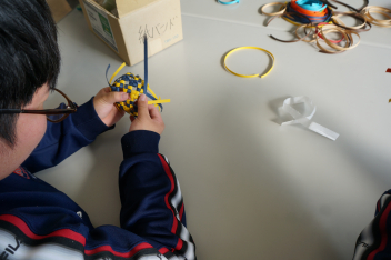 紙バンド(クラフトバンド)で何かを編んでいるようです