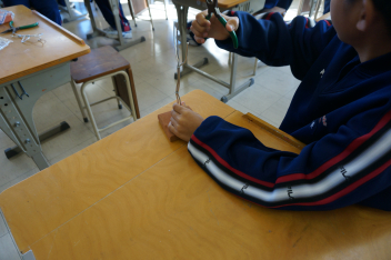 授業では、篆書体に限らず様々な字体で名前などの文字を彫ったり、かんたんなイラストなどを彫ったりしていますsad