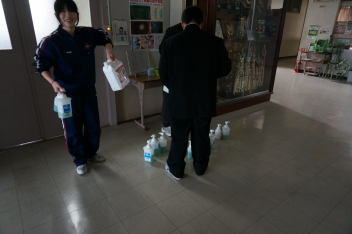 保健室の前にせっけん液のボトルがたくさん集められていました