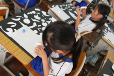 2年生は、図画工作科で「はさみでアート」の学習をしました。はさみでチョキチョキ切った紙から、イメージを膨らませて組み合わせ、貼り合わせて、作品を作りました。