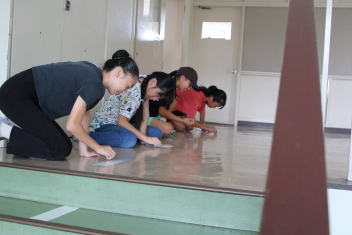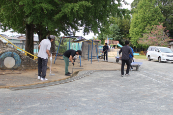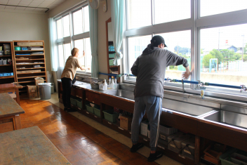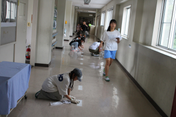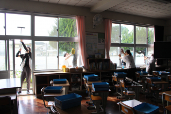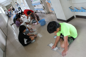 教室や廊下の窓の清掃、廊下の床清掃、運動場の排水溝の清掃をしていただきました。
