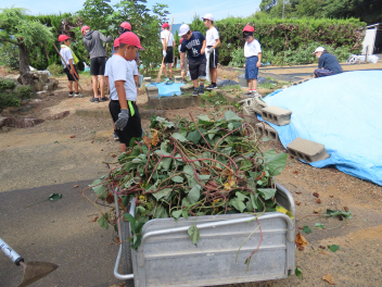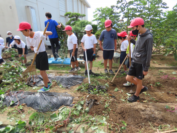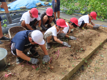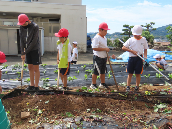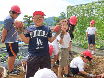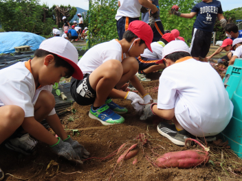 まずは、長く伸びたつるを切り、一輪車に乗せて運びました。手で土を掘ってみると、大きなサツマイモがたくさん出てきました。なかなか抜けないときは友達に声を掛けて、協力して掘る姿が見られました。少し乾燥させてから、お菓子作りをする予定です。力仕事も多かったですが、よくがんばりました