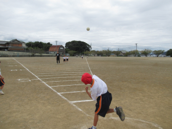 1年生の体育では、新体力テストの測定をしています。今日は50m走とソフトボール投げを行いました。