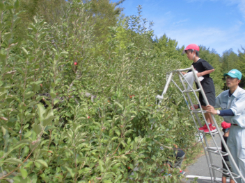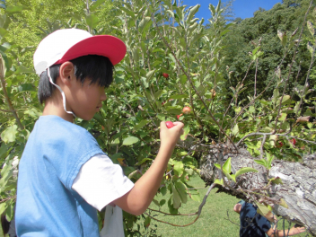 フルーツパークに着いて、最初に行った活動はりんごの収穫体験です