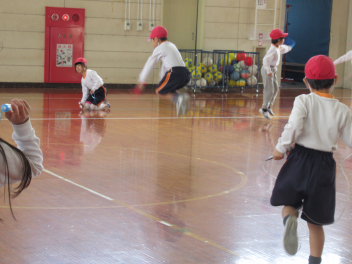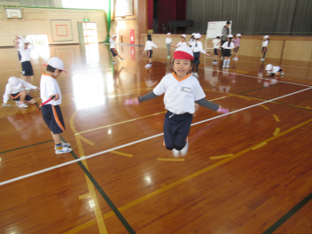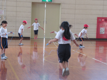 今日の体育では縄跳びを行いました。「脇をしめるとうまく跳べるよ。」「こんな跳び方もできるよ。」など、友達と見合いながら楽しそうに縄を跳んでいる姿がたくさん見られました。