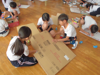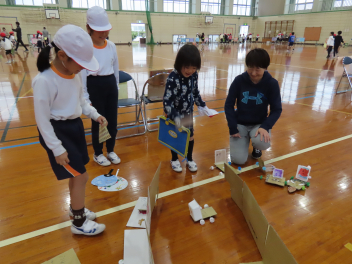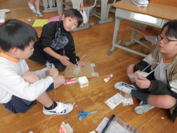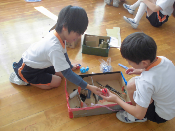 • 現在、2年生は生活科で身の回りの物を使って、動くおもちゃを作っています。グループに分かれて、活動中です。そして、どうすればもっとよく動くようになるのか、どうしたらみんなと楽しく遊べるのか考えていきます。