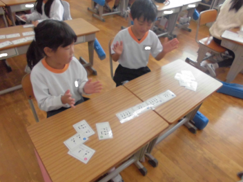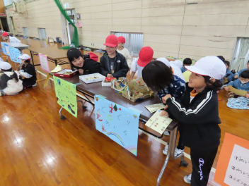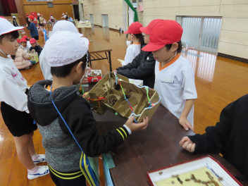 1年生の生活科「たのしいあきいっぱい」の単元で、秋の自然物を使ったおもちゃ作りをしました。「ポンタランド」ではグループでお店屋さんとなって、地域の幼稚園児や1・2年生の他のグループの子に作ったおもちゃで遊んでもらいました。