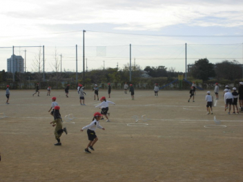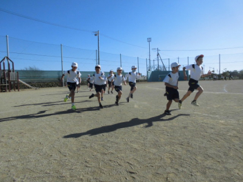 12/11(木)運動場では1年生が「かけっこ」、6年生が「ティーボール」の学習をしています。