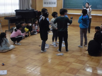 音楽室では2年生が曲に合わせてリズム打ちの学習をしています。
