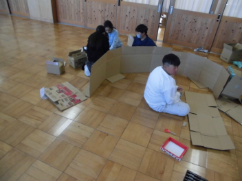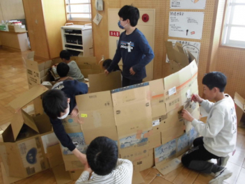 段ボールを材料にして、大きな町と小さな町をつくっていきます。