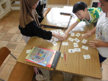 •  9/25(木)3年生の「外国語活動」は、聞き取った英語に合ったものを、かるたで取ります。