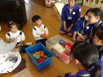 にじ組の子たちは、お姉さんたちと大好きなブロック遊びをしましたfrown
