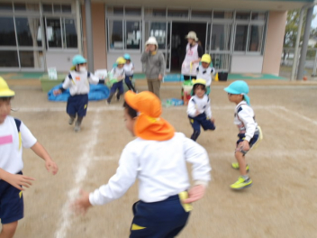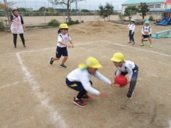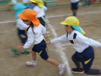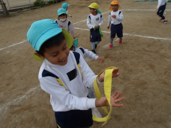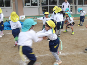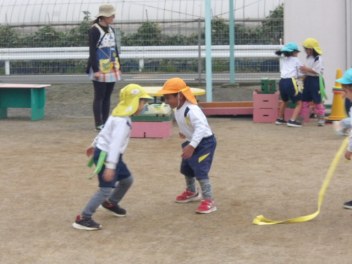 年中児と年長児は、一緒にしっぽ取りで遊びました。繰り返し遊んでいるので、上手になってきました