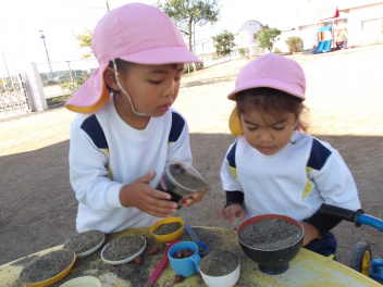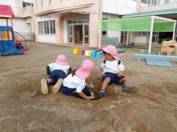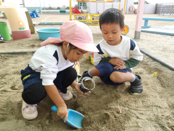 友達を意識するようになった3歳児さんは、同じ場所で同じものを持ったり、同じことをして遊ぶようになりましたsad