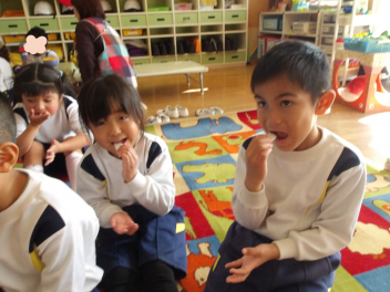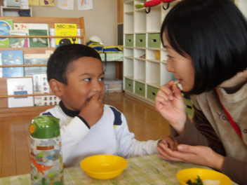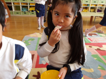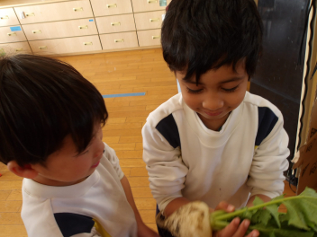 お友達が持ってきてくれたカブを園務員さんが塩もみにしてくれて、おやつとして食べました お話会でも大きなカブのお話を聴き、担任の先生も絵本を読んでくれたので、カブがとても身近になりましたねcheeky