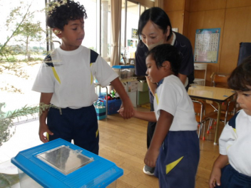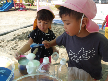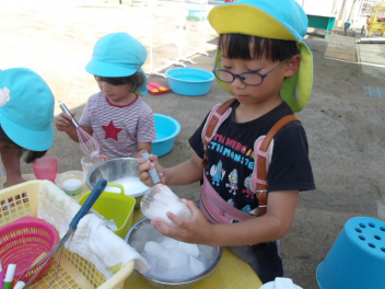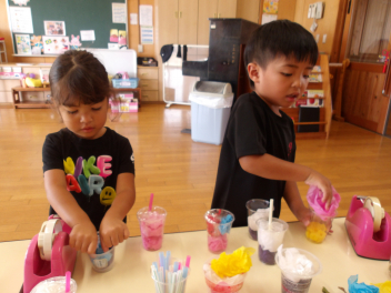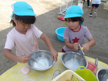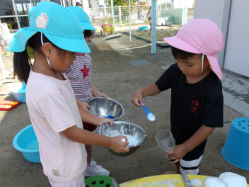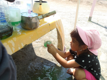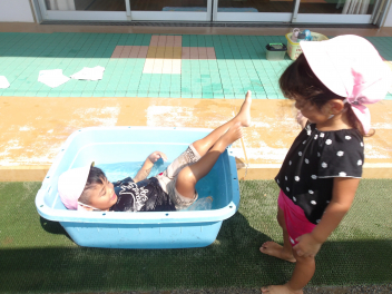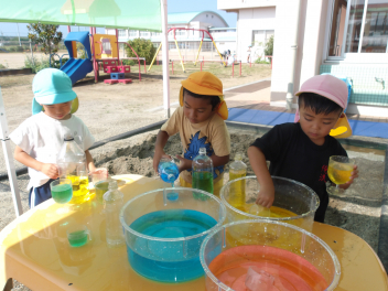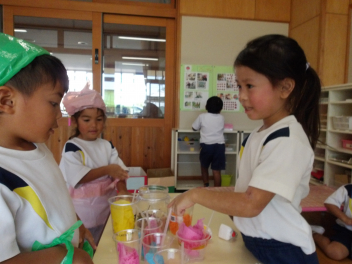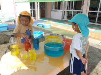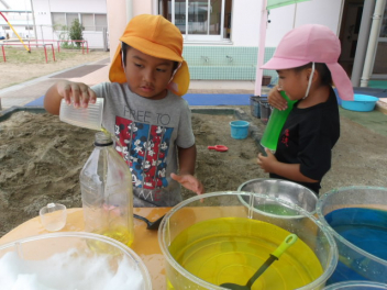 綺麗な色の水で遊んでいると「入れて」と大きい組さんが入ってきたよ