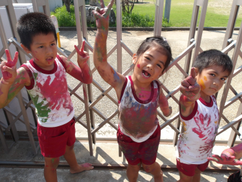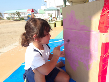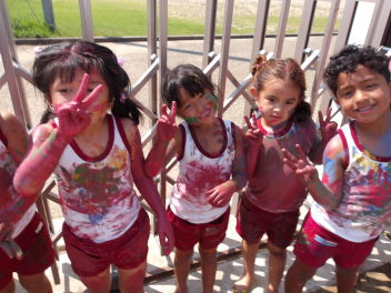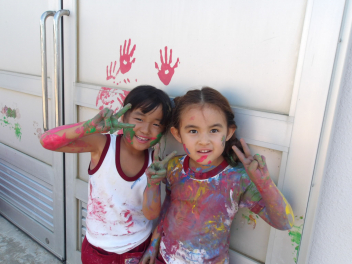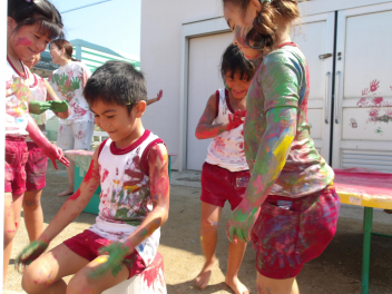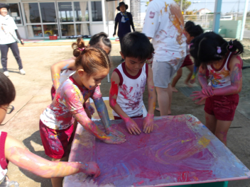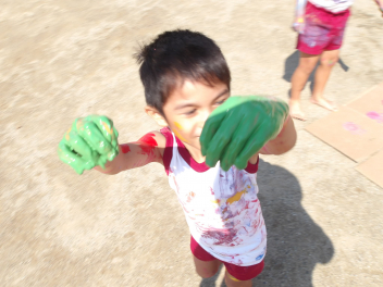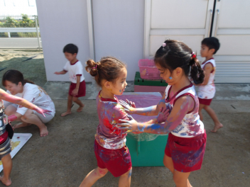 そら組さんが園庭で絵の具だらけになって遊びましたwink